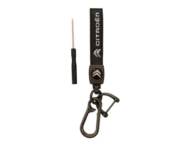 Μπρελόκ μάρκας αυτοκινήτου Citroen με κρίκο για κλειδιά και δυνατότητα σύνδεσης σε ζώνη ή τσάντα. Διαθέτει επίσης δερμάτινο λουράκι καρπού, καθιστώντας το άνετο στη μεταφορά. Με αυτό, τα κλειδιά σας θα βρίσκονται σε ασφαλές μέρος. Είναι κατάλληλο όχι μόνο για κλειδιά αυτοκινήτου, αλλά και για άλλους. Μπορείτε να το αποκτήσετε ως δώρο σε έναν φίλο, έναν εραστή ή έναν πραγματικό φανατικό θαυμαστή της Citroen.