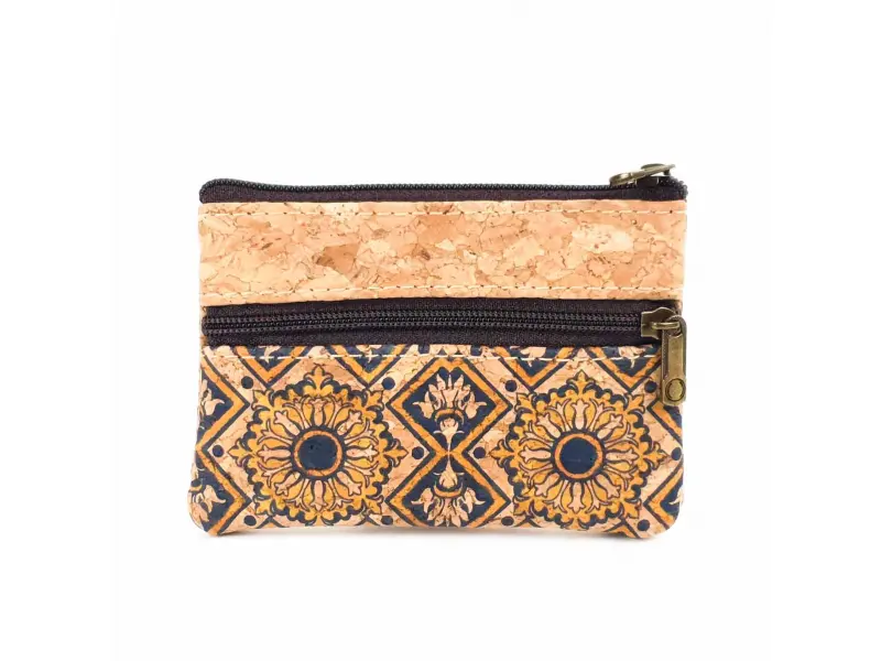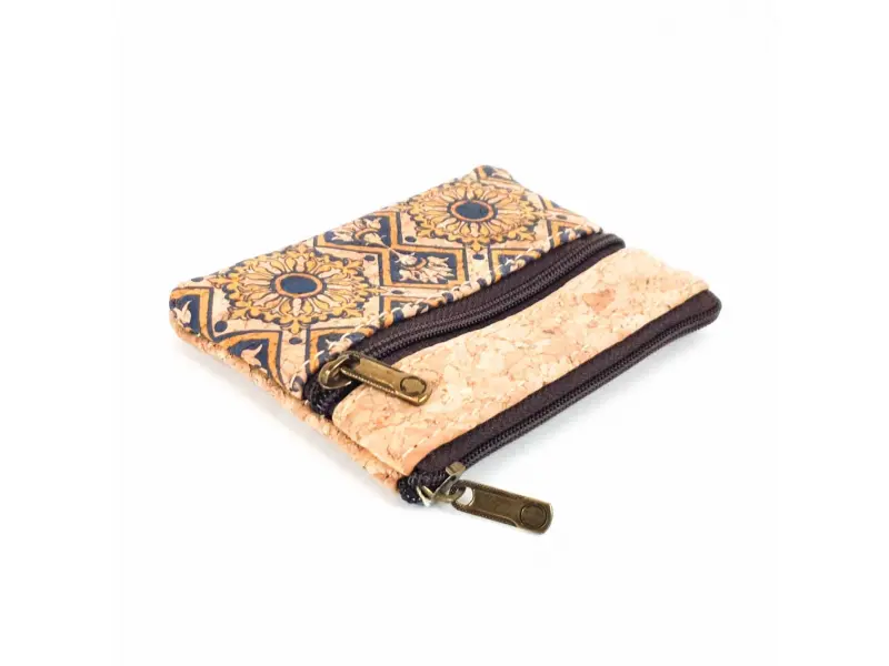 Μικρό πορτοφόλι για κέρματα από φελλό. Πορτοφόλι για κέρματα από οικολογικό υλικό με δύο θήκες με φερμουάρ και χώρο για χαρτονομίσματα και κέρματα.