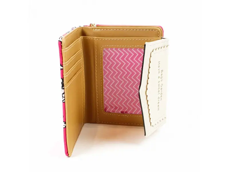 Γυναικείο πορτοφόλι μικρού μεγέθους από οικολογικό δέρμα σε χρώμα κυκλάμινο. Πορτοφόλι με θήκη για χαρτονομίσματα, χώρο για κάρτες και προσωπικά έγγραφα και εξωτερική θήκη για κέρματα με φερμουάρ.