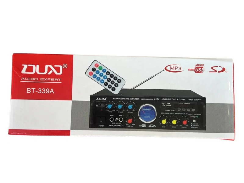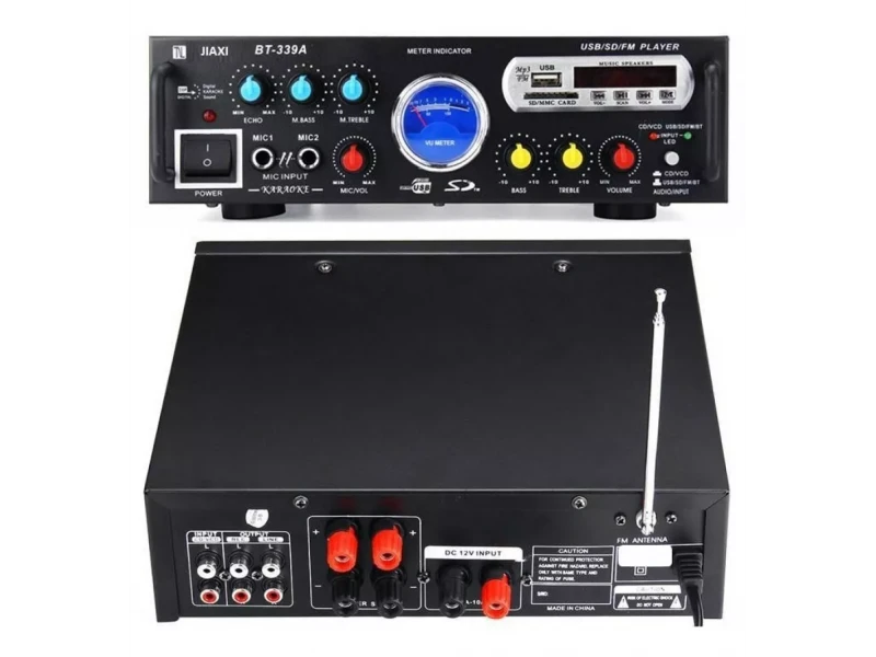 Περιγραφή: Ο ενισχυτής ήχου είναι ένας πολυλειτουργικός στερεοφωνικός ενισχυτής που προσφέρει υψηλή ποιότητα ήχου, ασύρματη συνδεσιμότητα μέσω Bluetooth και πολλαπλές επιλογές για σύνδεση σε διάφορες συσκευές ήχου. Είναι σχεδιασμένο τόσο για οικιακό ήχο όσο και για επαγγελματική χρήση σε μικρά δωμάτια ή γραφεία. Συμπαγής και εύκολος στη χρήση, αυτός ο ενισχυτής παρέχει ισχυρό ήχο και εύκολο έλεγχο των συνδεδεμένων συσκευών. Χαρακτηριστικά: Συνδεθείτε εύκολα με οποιεσδήποτε συσκευές Bluetooth, όπως smartphone, tablet και φορητούς υπολογιστές για ασύρματη αναπαραγωγή μουσικής. Υποστηρίζει εισόδους RCA για παραδοσιακές πηγές ήχου (CD player, DVD player και άλλα), θύρα USB για αναπαραγωγή μουσικής από μνήμη flash και υποδοχή κάρτας SD. Το σετ περιλαμβάνει τηλεχειριστήριο για εύκολη εναλλαγή μεταξύ λειτουργιών και ρύθμιση της έντασης από απόσταση. Ενσωματωμένη δυνατότητα ρύθμισης των μπάσων, των πρίμων και της ισορροπίας ήχου. Ενσωματωμένο ραδιόφωνο FM για ακρόαση ραδιοφωνικών σταθμών με δυνατότητα αυτόματης σάρωσης συχνοτήτων. Σχέδιο: Το προϊόν διαθέτει μοντέρνο και συμπαγή σχεδιασμό, κατάλληλο για διάφορους εσωτερικούς χώρους. Το πάνελ είναι κατασκευασμένο από μέταλλο με απαλό μαύρο φινίρισμα και διαθέτει μια διαισθητική οθόνη που δείχνει πληροφορίες σχετικά με την πηγή εισόδου και την τρέχουσα συχνότητα ραδιοφώνου FM. Τα κουμπιά ελέγχου βρίσκονται κυρίως στον μπροστινό πίνακα για εύκολη πρόσβαση, ενώ το πίσω μέρος περιέχει όλες τις εισόδους και εξόδους ήχου. Τεχνικά χαρακτηριστικά: Ισχύς εξόδου: 2 x 40W; Αντίσταση: 4-16 Ohms; Εύρος συχνοτήτων: 20Hz – 20kHz; Εύρος Bluetooth: Έως 10 μέτρα. Συχνότητες FM: 87,5 MHz - 108 MHz; Είσοδοι: 2 είσοδοι RCA, θύρα USB, υποδοχή SD, κεραία FM. Τροφοδοσία: AC 220V / 50Hz; Διαστάσεις: 26 cm x 21 cm x 6 cm.; Βάρος: 1,8 kg. Τι θα βρείτε στη συσκευασία: 1 x BT-339A ενισχυτής ήχου; 1 x Τηλεχειριστήριο; 1 x κεραία FM. 1 x καλώδιο τροφοδοσίας; Εγχειρίδιο χρήστη? Συσκευασία μεταφοράς; Εγγύηση: 12 μήνες.