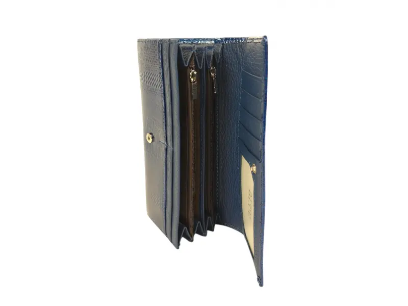 Μπλε λουστρίνι πορτοφόλι - Γυναικεία τσάντα από γνήσιο δέρμα και λουστρίνι - Θέσεις για χαρτονομίσματα. Δύο θήκες με φερμουάρ. - Διαμερίσματα εγγράφων - Πίσω τσέπη με φερμουάρ. - Κλείσιμο με κουμπί κλικ.