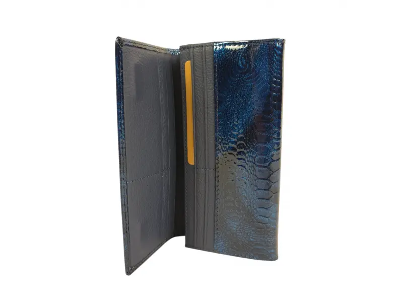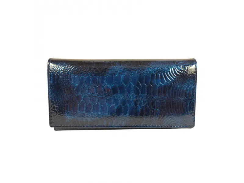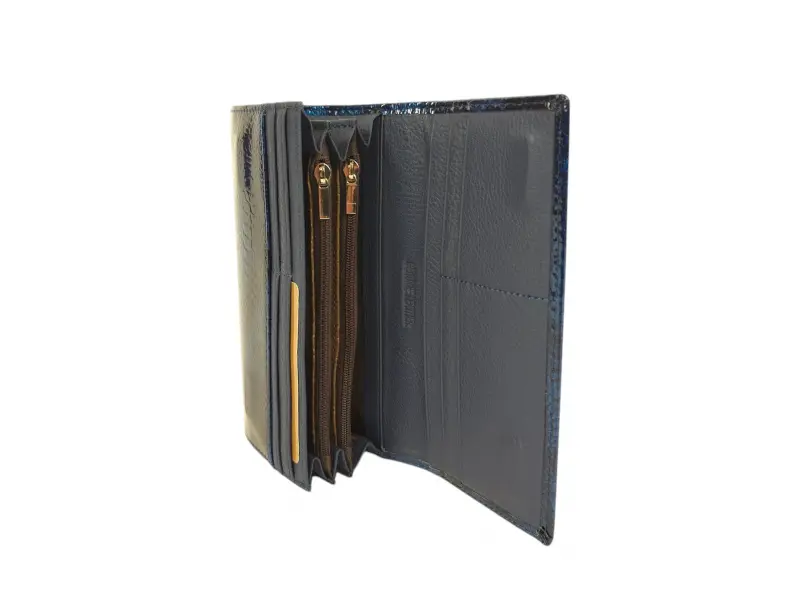 Μπλε γυναικείο πορτοφόλι από γνήσιο δέρμα και λουστρίνι. Μεγάλο γυναικείο πορτοφόλι με θήκες για χαρτονομίσματα, υποδοχές για κάρτες και προσωπικά έγγραφα και θήκη για κέρματα με φερμουάρ. Κομψό γυναικείο πορτοφόλι με ενδιαφέρον σχέδιο.