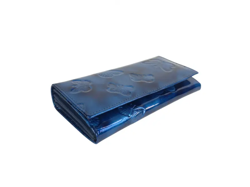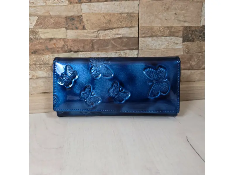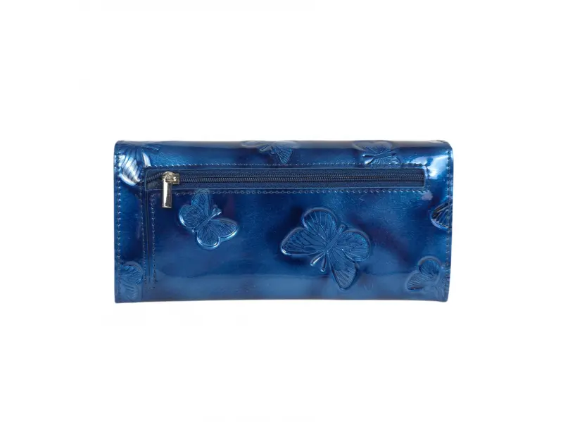Μπλε λουστρίνι πορτοφόλι - Γυναικεία τσάντα από γνήσιο δέρμα και λουστρίνι - Θέσεις για χαρτονομίσματα. - Θήκη για κέρματα με φερμουάρ. - Διαμερίσματα εγγράφων - Πίσω τσέπη με φερμουάρ. - Κλείσιμο με κουμπί κλικ. - Η διάταξη των πεταλούδων μπορεί να είναι διαφορετική.