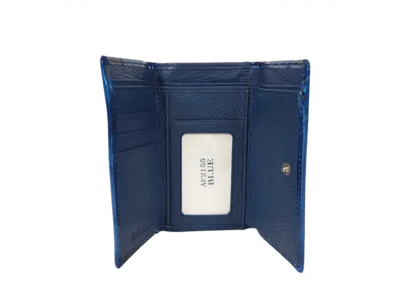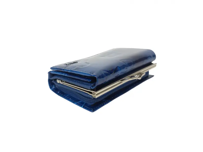 Μπλε γυναικείο πορτοφόλι από γνήσιο δέρμα και λουστρίνι. Μεσαίο γυναικείο πορτοφόλι με θήκες για χαρτονομίσματα, υποδοχές για κάρτες και ταυτότητες και θήκη για κέρματα με φερμουάρ. Κομψό γυναικείο πορτοφόλι με ενδιαφέρον σχέδιο.