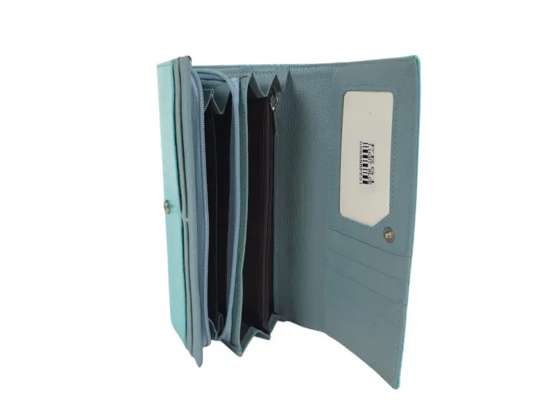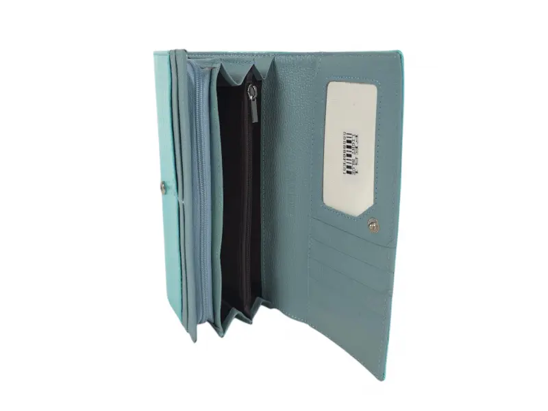 Μπλε γυναικείο πορτοφόλι από γνήσιο δέρμα και λουστρίνι. Μεγάλο γυναικείο πορτοφόλι με θήκες για χαρτονομίσματα, υποδοχές για κάρτες και προσωπικά έγγραφα και θήκη για κέρματα με φερμουάρ. Όμορφο γυναικείο πορτοφόλι με ενδιαφέρον σχέδιο.