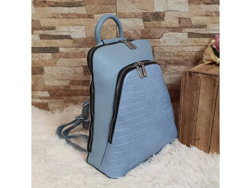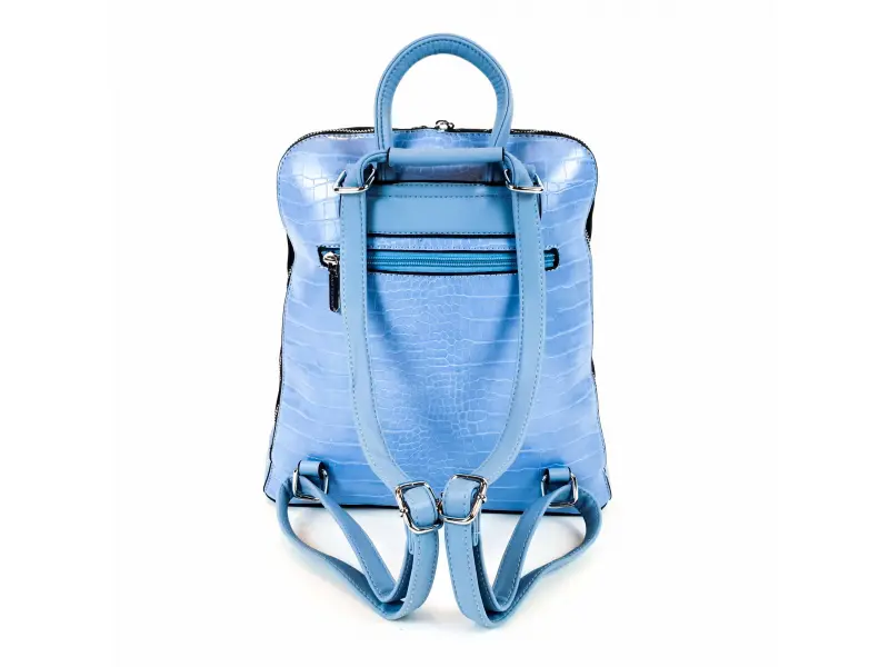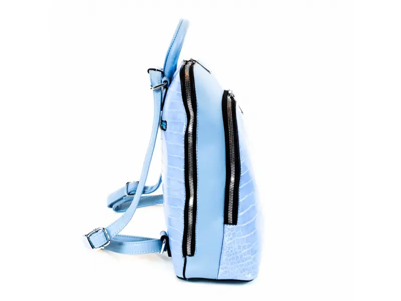 Ενδιαφέρον γυναικείο σακίδιο πλάτης από τεχνητό δέρμα, το οποίο μπορεί να φορεθεί και ως τσάντα χειρός. Ανοιχτό μπλε γυναικείο σακίδιο πλάτης με μία κύρια θήκη με φερμουάρ, μια μικρή εσωτερική τσέπη με φερμουάρ, μια θέση για τηλέφωνο και έγγραφα, μια μπροστινή και μια πίσω τσέπη με φερμουάρ. Μοντέρνο σακίδιο πλάτης με άνετα ρυθμιζόμενα λουράκια.