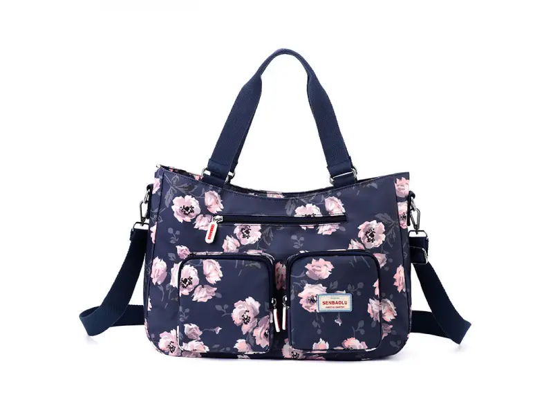 Γυναικεία τσάντα χειρός με λουλούδια - Υφασμάτινη τσάντα χειρός. - Μία κύρια θήκη με φερμουάρ. - Τρεις μπροστινές τσέπες με φερμουάρ. Εσωτερική τσέπη με φερμουάρ. - Θήκη για τηλέφωνο και έγγραφα. - Άνετες λαβές για μεταφορά στο χέρι. - Ρυθμιζόμενη, μακριά λαβή.