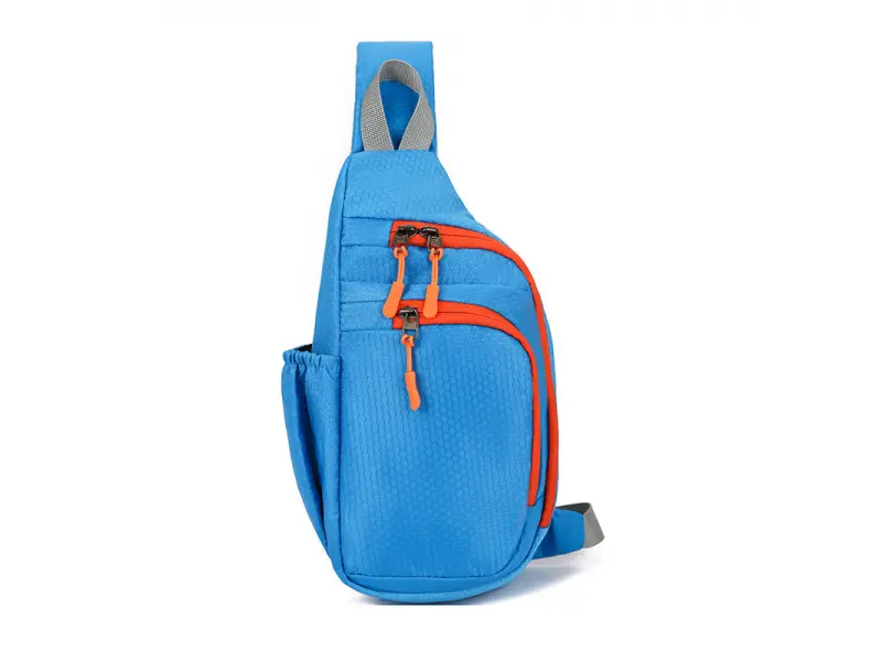 Μπλε τσάντα στήθους - Μια ανδρική τσάντα που μπορεί να φορεθεί στο στήθος, τον ώμο ή την πλάτη σαν σακίδιο πλάτης. - Μία κύρια θήκη με φερμουάρ. - Εσωτερικό διαμέρισμα. Μπροστινή τσέπη με φερμουάρ. Πλαϊνή τσέπη για μπουκάλι. Τσέπη με φερμουάρ στον ιμάντα ώμου. Ρυθμιζόμενος ιμάντας ώμου. - Θόρυβος αναπνοής.