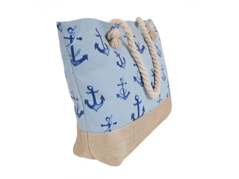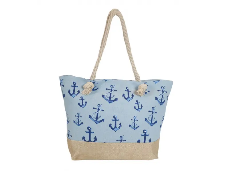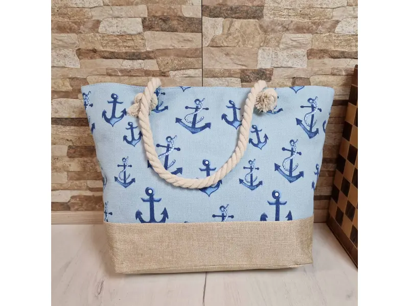 Μεγάλη τσάντα θαλάσσης με άγκυρες Μπλε τσάντα θαλάσσης από ποιοτικό ύφασμα με άγκυρες, μία θήκη με φερμουάρ και άνετες λαβές από σχοινί.