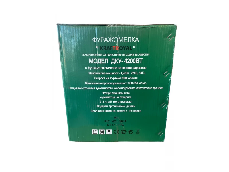 Μύλος ζωοτροφών KraftRoyal e με ισχύ 4200 W και τάση τροφοδοσίας 220 V. Χρησιμοποιείται για άλεσμα δημητριακών, σιταριού, καλαμποκιού κ.λπ. Η συνολική παραγωγικότητα της μηχανής είναι 300 kg/h. Έχει σταθερή κατασκευή με αντοχή στο φορτίο. Παρέχεται με 4 κόσκινα - 2, 3, 4, 5 mm.