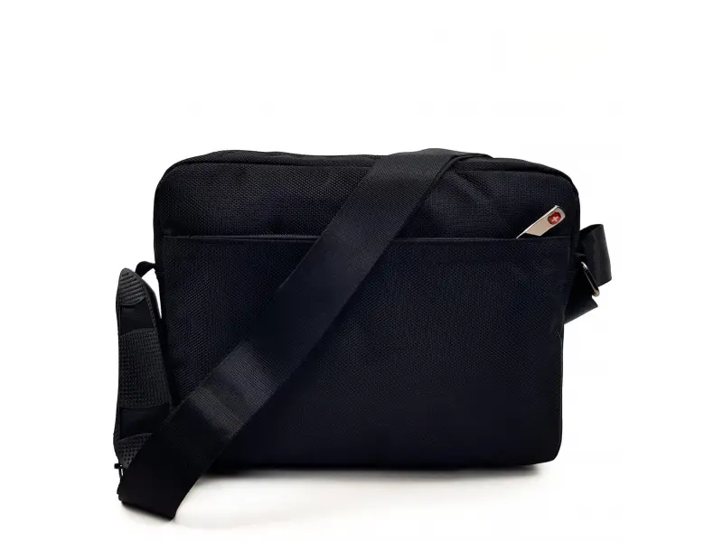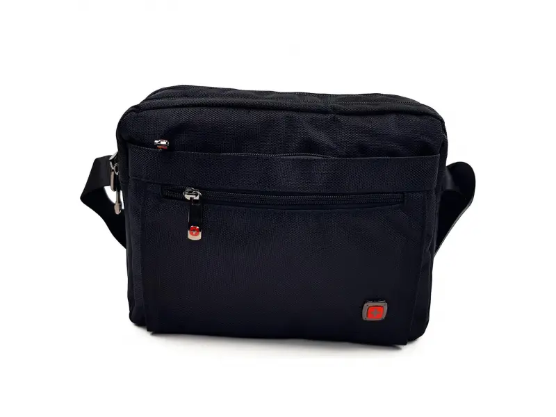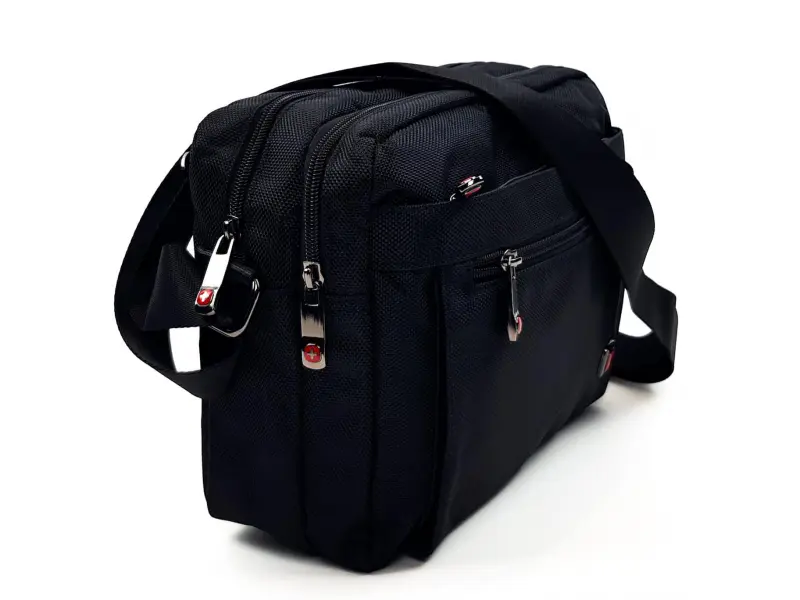 Ανδρική τσάντα από ποιοτικό ύφασμα σε μαύρο χρώμα με χιαστί, μακρύ ρυθμιζόμενο λουράκι ώμου από πολυεστέρα. Ανδρική τσάντα με δύο μεγάλες θήκες, μια μεσαία τσέπη, μια μπροστινή τσέπη και μια πίσω τσέπη που κλείνει με ποιοτικό φερμουάρ. Υπέροχη τσάντα με εσωτερικές θήκες και τσέπες.
