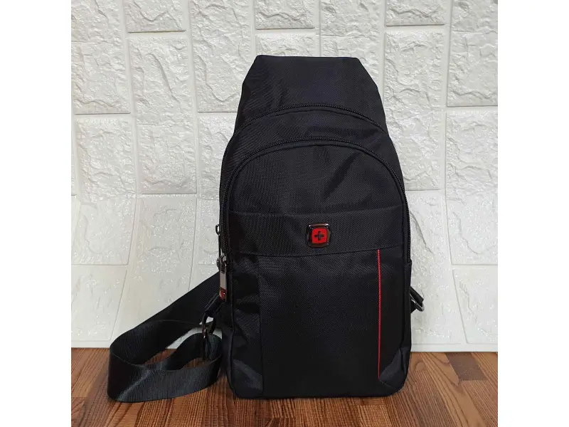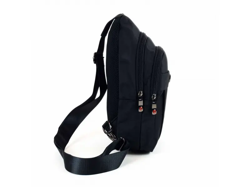 Ποιοτική ανδρική τσάντα σε μαύρο χρώμα. Ανδρική τσάντα που μπορεί να φορεθεί στο στήθος, τον ώμο ή την πλάτη σαν σακίδιο πλάτης. Τσάντα με μία μεγάλη θήκη, μια μικρή εσωτερική τσέπη με φερμουάρ, μια μπροστινή τσέπη με φερμουάρ και μια μπροστινή τσέπη με μαγνητικό κλείσιμο.