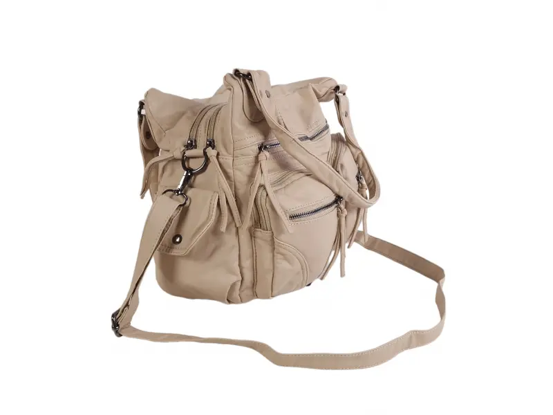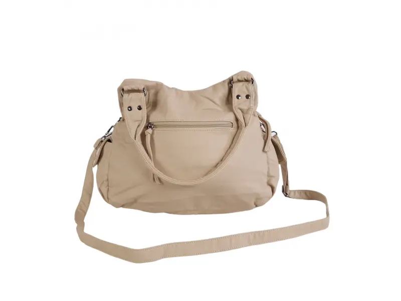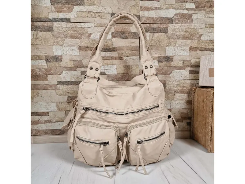 Ποιοτική τσάντα χειρός - Γυναικεία τσάντα χειρός από βρασμένο δέρμα. - Δύο κύριες θήκες με φερμουάρ. - Μικρή εσωτερική τσέπη με φερμουάρ. - Θήκες για τηλέφωνο και έγγραφα. - Πέντε μπροστινές τσέπες με φερμουάρ. - Πίσω τσέπη με φερμουάρ. Δύο πλαϊνές τσέπες. - Άνετες λαβές μεταφοράς. - Μακριά ρυθμιζόμενη λαβή.