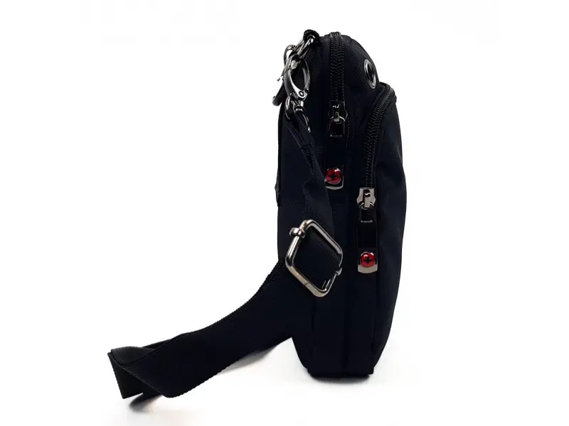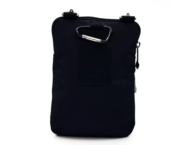 Μαύρη ανδρική τσάντα από ανθεκτικό ύφασμα και ανθεκτικά φερμουάρ με ρυθμιζόμενο λουράκι ώμου και δυνατότητα σύνδεσης με ζώνη. Μικρή σπορ - κομψή ανδρική τσάντα.