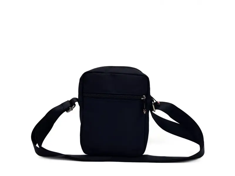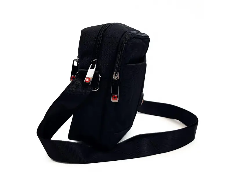 Ανδρική τσάντα υψηλής ποιότητας με ρυθμιζόμενη λαβή από πολυεστέρα και ανθεκτικό ύφασμα σε μαύρο χρώμα με κόκκινο σταυρό. Βολική διάταξη θηκών - δύο μεγάλες θήκες, πίσω και μπροστινές τσέπες που κλείνουν με φερμουάρ υψηλής ποιότητας.