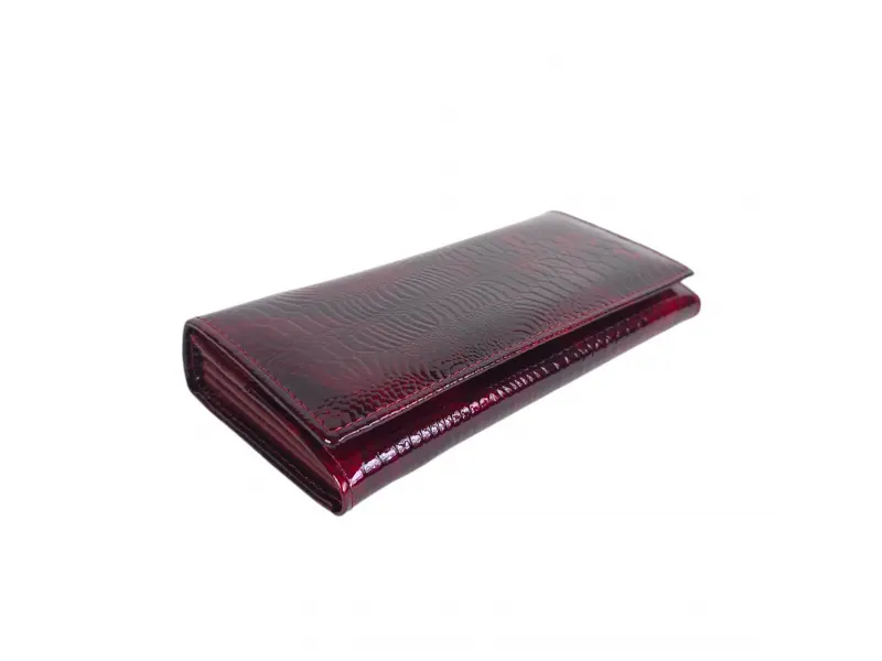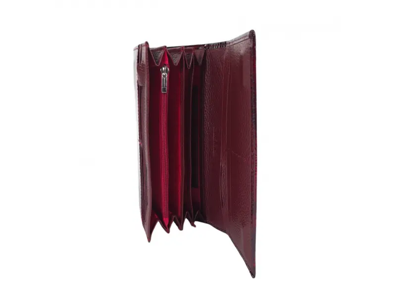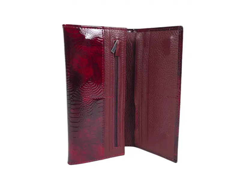 Γυναικείο πορτοφόλι σε μπορντό χρώμα από γνήσιο δέρμα και λουστρίνι. Μεγάλο γυναικείο πορτοφόλι με θήκες για χαρτονομίσματα, υποδοχές για κάρτες και ταυτότητες και θήκη για κέρματα με φερμουάρ. Μεγάλο πορτοφόλι σε καλή τιμή.