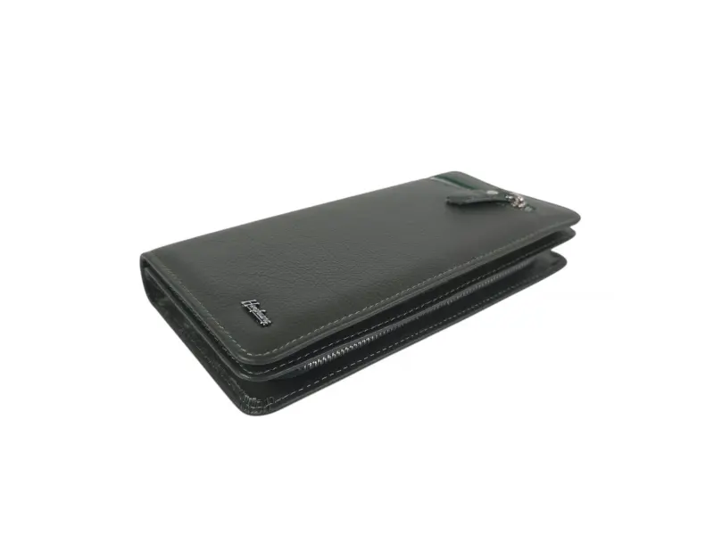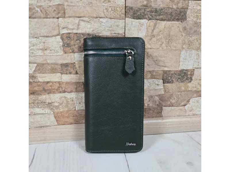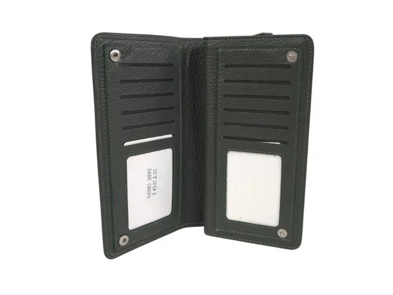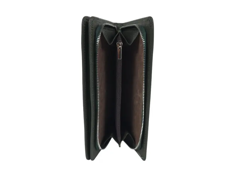 Μεγάλο γυναικείο πορτοφόλι από γνήσιο δέρμα υψηλής ποιότητας. Κάθετο γυναικείο πορτοφόλι σε πράσινο χρώμα με θήκες για χαρτονομίσματα, θήκες για κάρτες και προσωπικά έγγραφα και θήκη για κέρματα με φερμουάρ.
