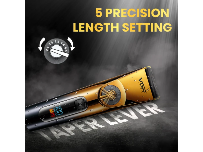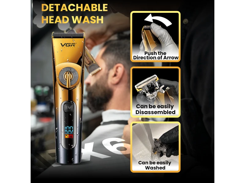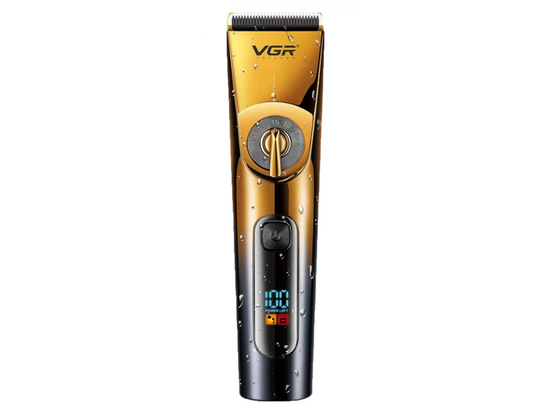 Το VGR 663 είναι μια κουρευτική μηχανή μπαταρίας με κομψό χρυσό-μαύρο σχέδιο που μπορεί να χρησιμοποιηθεί τόσο σε ινστιτούτα αισθητικής όσο και στο σπίτι. Η κουρευτική μηχανή είναι εύκολη στη χρήση και είναι εξοπλισμένη με έναν ισχυρό κινητήρα και μια κεραμική λεπίδα, η οποία επιτρέπει γρήγορο και εύκολο κόψιμο. Το VGR 663 περιλαμβάνει πέντε εξαρτήματα διαφορετικών μεγεθών και μια βίδα για τη ρύθμιση του ύψους της λεπίδας - από 0,5 έως 2,5 χιλ., με την οποία μπορείτε εύκολα να ελέγξετε το μήκος των μαλλιών που θέλετε να κόψετε και να δημιουργήσετε διαφορετικά χτενίσματα. Το μηχάνημα φορτίζεται χρησιμοποιώντας το καλώδιο USB που περιλαμβάνεται στο σετ. Χαρακτηριστικά: Λειτουργία κλειδώματος του κουμπιού ενεργοποίησης/απενεργοποίησης - Κλείδωμα ταξιδιού. Οθόνη με απεικόνιση της μπαταρίας που απομένει. Χρόνος φόρτισης: περίπου 3 ώρες. Χρόνος χρήσης: 200 λεπτά; Χωρητικότητα μπαταρίας: 2000mAh; Τάση φόρτισης: 5V-1A; Δυνατότητα ρύθμισης μήκους 0,5-2,5mm χωρίς προσάρτηση. Βαθμός προστασίας από το νερό: IP X6 Το σετ περιλαμβάνει: 1 x κουρευτική μηχανή? 1 x βούρτσα καθαρισμού. 5 x εξαρτήματα με μήκος 3 / 4-6 / 7-9 / 10-12 / 16-18 mm. 1 x καλώδιο φόρτισης USB. 1 x προφυλακτήρας λεπίδας 1 x λιπαντικό? 1 x Εγχειρίδιο χρήστη.
