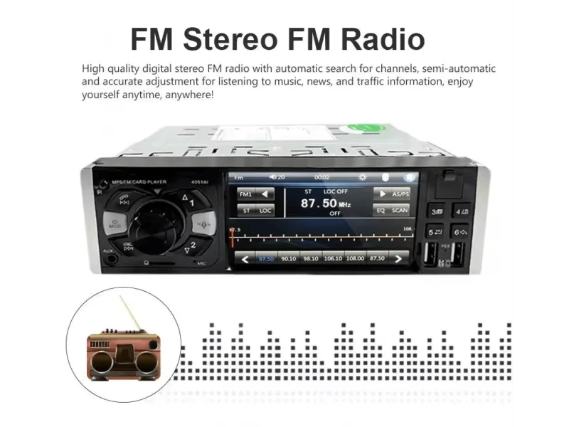 Το ραδιόφωνο αυτοκινήτου MP5, μοντέλο 4053AI, είναι μια σύγχρονη συσκευή πολυμέσων αυτοκινήτου που συνδυάζει ένα ευρύ φάσμα λειτουργιών αναπαραγωγής πολυμέσων, παρέχοντας στους χρήστες μια ποιοτική οπτικοακουστική εμπειρία στο αυτοκίνητο. Η συσκευή υποστηρίζει αναπαραγωγή αρχείων MP3, MP4 και MP5 και προσφέρει τη δυνατότητα σύνδεσης με εξωτερικές συσκευές μέσω Bluetooth, USB και κάρτας SD.