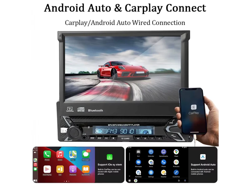 Ραδιόφωνο πολυμέσων μίας οθόνης με μηχανοκίνητη οθόνη IPS 7″ (1024×600), Android 15, MOSFET 50×4, ασύρματο Apple CarPlay/Android Auto, Bluetooth, SWC, τηλεχειριστήριο υπερύθρων και AV-IN για 2 κάμερες.
