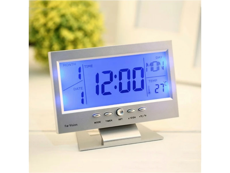 Ρολόι με ξυπνητήρι, αισθητήρα ήχου, ένδειξη θερμοκρασίας, έγχρωμη φωτιζόμενη LCD οθόνη με μεγάλα ψηφία και ημερολόγιο. Διαθέτει φωτισμό ο οποίος ενεργοποιείται με κάθε ήχο.
