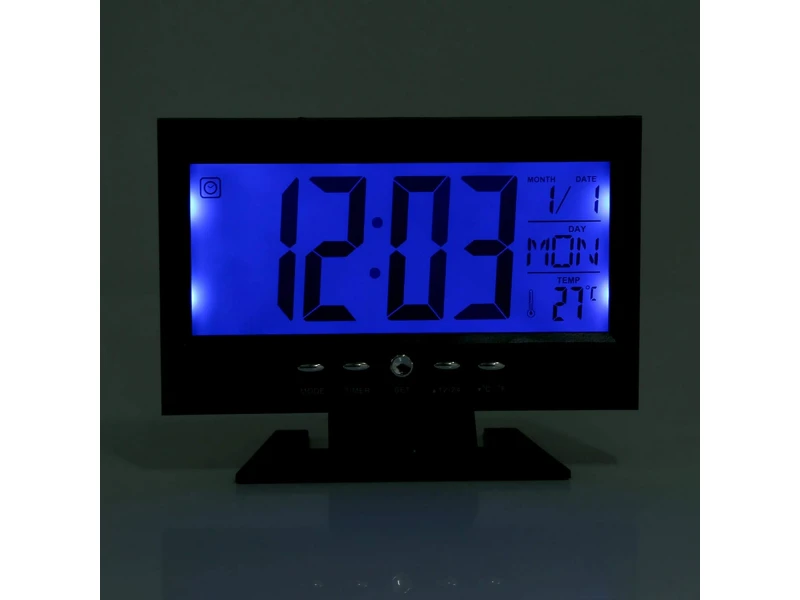 Ρολόι με ξυπνητήρι, αισθητήρα ήχου, ένδειξη θερμοκρασίας, έγχρωμη φωτιζόμενη LCD οθόνη με μεγάλα ψηφία και ημερολόγιο. Διαθέτει φωτισμό ο οποίος ενεργοποιείται με κάθε ήχο.