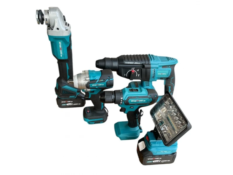 Σετ ασύρματου κρουστικού δράπανου, γωνιακού τροχού, κλειδιού, κατσαβιδιού και λάμπας εργασίας με 3 μπαταρίες 36V 8Ah και φορτιστή KraftRoyal