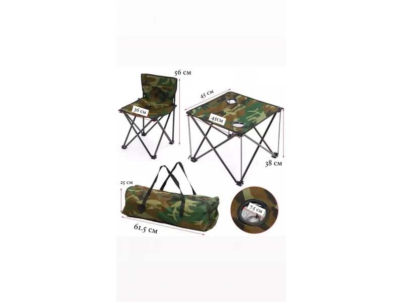 Αυτό το σετ κάμπινγκ είναι τέλειο για τους λάτρεις της υπαίθριας και της περιπέτειας. Αποτελείται από ένα πτυσσόμενο τραπέζι με σχέδιο καμουφλάζ και τέσσερις άνετες καρέκλες που διπλώνουν για εύκολη αποθήκευση και μεταφορά. Μπορεί να χρησιμοποιηθεί για κάμπινγκ, πικνίκ, ψάρεμα, μπάρμπεκιου ή οποιεσδήποτε άλλες υπαίθριες δραστηριότητες.