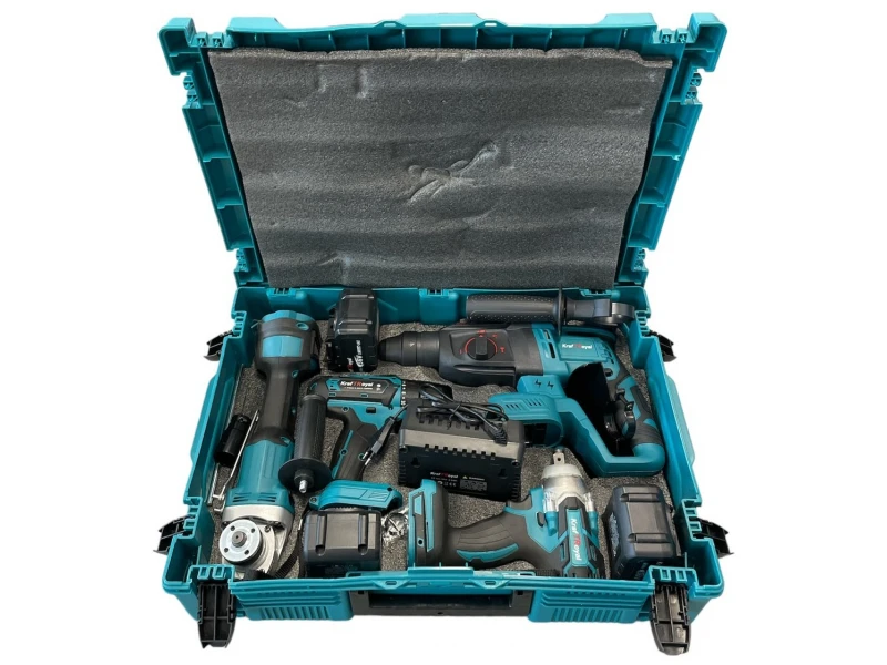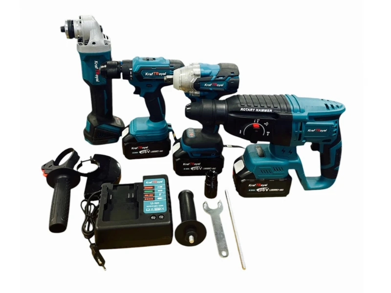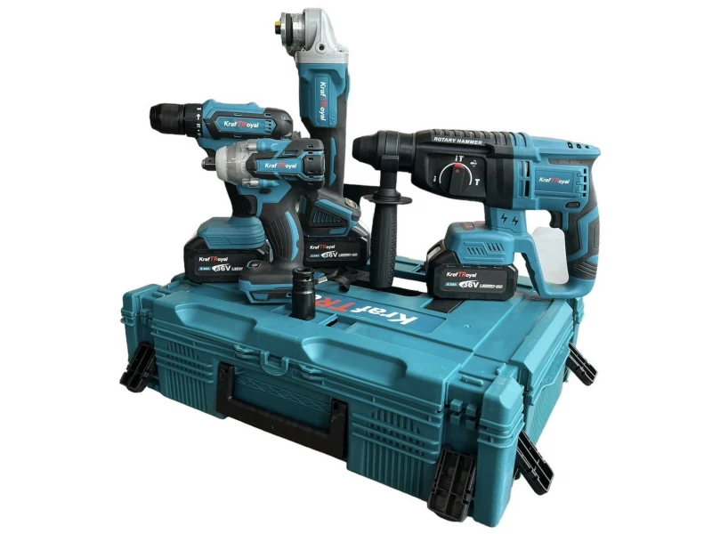 Ένα σετ σφυροδράπανο, γωνιακός μύλος, κλειδί και κατσαβίδι 36V με μπαταρίες 3 x 8Ah και φορτιστή KraftRoyal - η ιδανική επιλογή για επαγγελματίες και λάτρεις των ποιοτικών εργαλείων. Ισχυρά, αξιόπιστα και με μεγάλη διάρκεια μπαταρίας, αυτά τα εργαλεία θα καλύψουν όλες τις ανάγκες σας για εργασία στο σπίτι και στο εργοτάξιο.