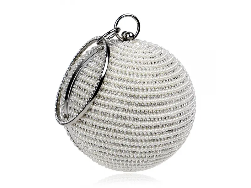 Σφαιρική βραδινή τσάντα - Επίσημη τσάντα χειρός με μία θήκη. - Άνοιγμα και κλείσιμο με μηχανισμό. - Ασημένια μπορντούρα. - Λαβή για μεταφορά στο χέρι. - Λαβή τύπου μακριάς αλυσίδας.