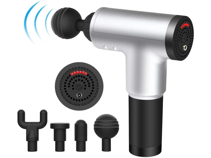 Οικιακό μασάζ / πιστόλι μασάζ / Fascial Gun τονώνει το σώμα και βοηθά στη χαλάρωση του μυϊκού ιστού σε βάθος με τη βοήθεια κινήσεων κραδασμών και κραδασμών, 4 προσαρτημάτων και 6 ταχύτητες μασάζ.