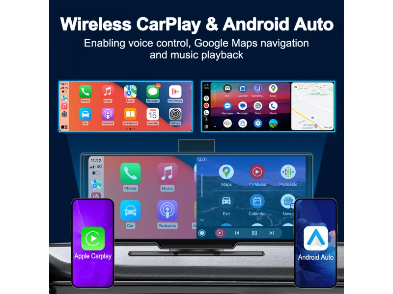 CarPlay/Android Auto πολυμέσων H605D-DVR 10,26″ IPS με διπλό DVR (μπροστά 2K, πίσω 1080P), Bluetooth, WiFi, Mirror Link, AUX, εύκολη εγκατάσταση για κονσόλα V851S3 και τροφοδοτικό 5V/3A.