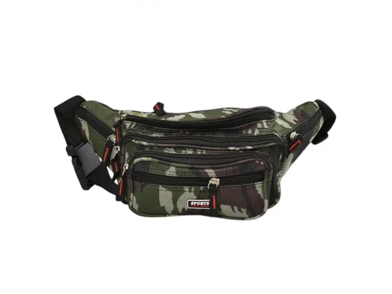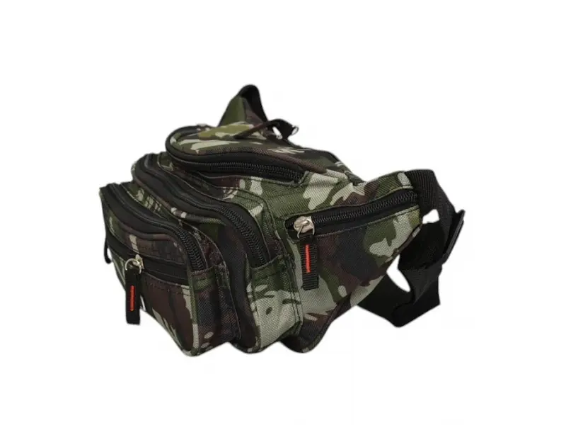 Στρατιωτική τσάντα μέσης Τσάντα χιαστί από ύφασμα παραλλαγής. Ανδρική τσάντα με μια κύρια θήκη με φερμουάρ, τρεις μπροστινές τσέπες με φερμουάρ και μια πίσω τσέπη με φερμουάρ, δύο πλαϊνές τσέπες με φερμουάρ. Άνετη ανδρική τσάντα με ρυθμιζόμενη ζώνη από πολυεστέρα.