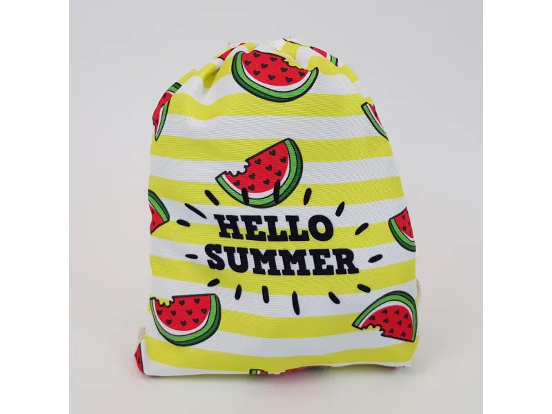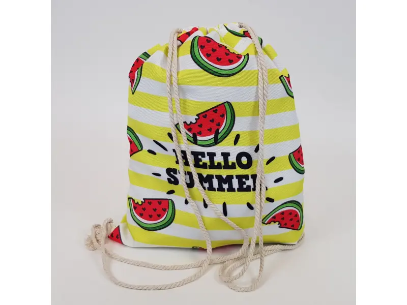 Σακίδιο πλάτης τύπου σάκου με μία θήκη, που δένει με λουράκια από σχοινί. Ποιοτική τσάντα σε κίτρινες και λευκές ρίγες και καρπούζια, με την επιγραφή Hello Summer. Τσάντα κατάλληλη για την παραλία και την καθημερινή ζωή.