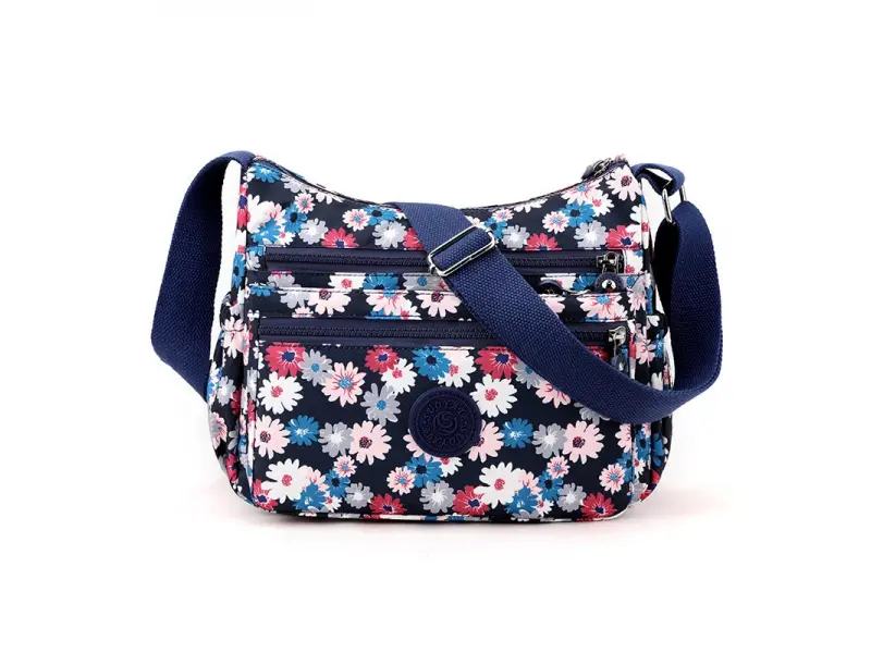 Μπλε υφασμάτινη τσάντα χειρός με λουλούδια - Υφασμάτινη τσάντα χειρός. - Μία κύρια θήκη με φερμουάρ. - Τρεις μπροστινές τσέπες με φερμουάρ. - Πίσω τσέπη με φερμουάρ. Δύο πλαϊνές τσέπες. - Μικρή εσωτερική τσέπη με φερμουάρ. - Θήκη για τηλέφωνο και έγγραφα. - Ρυθμιζόμενη, μακριά λαβή.