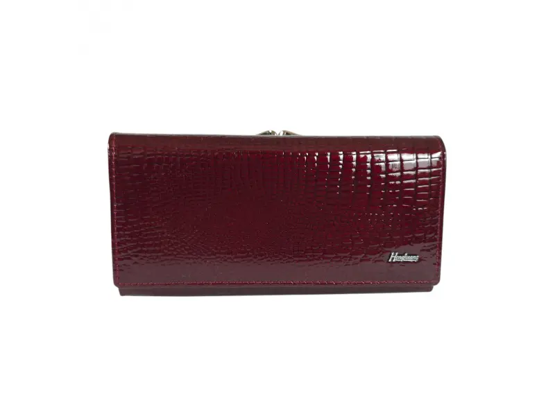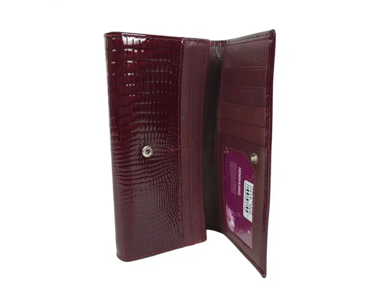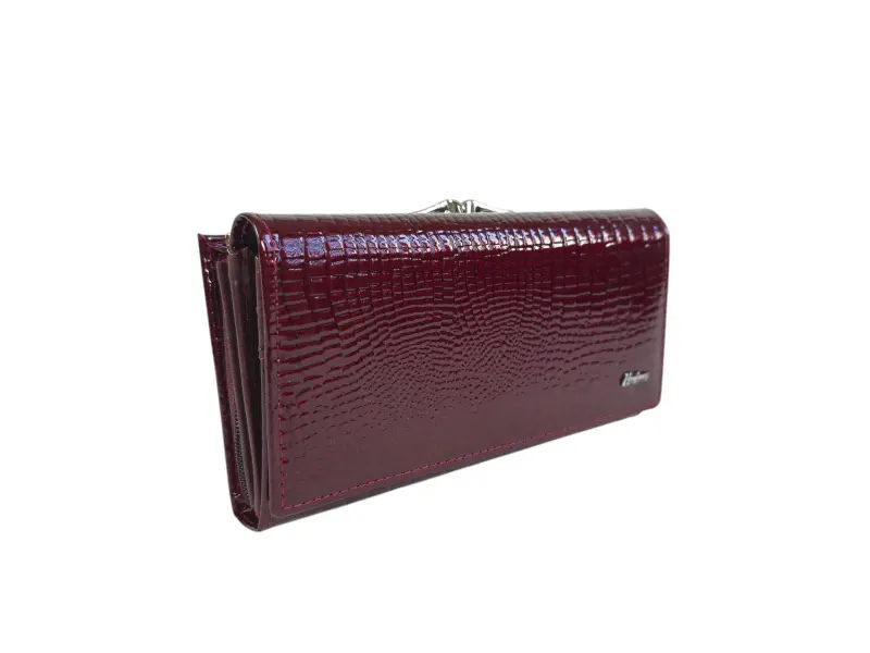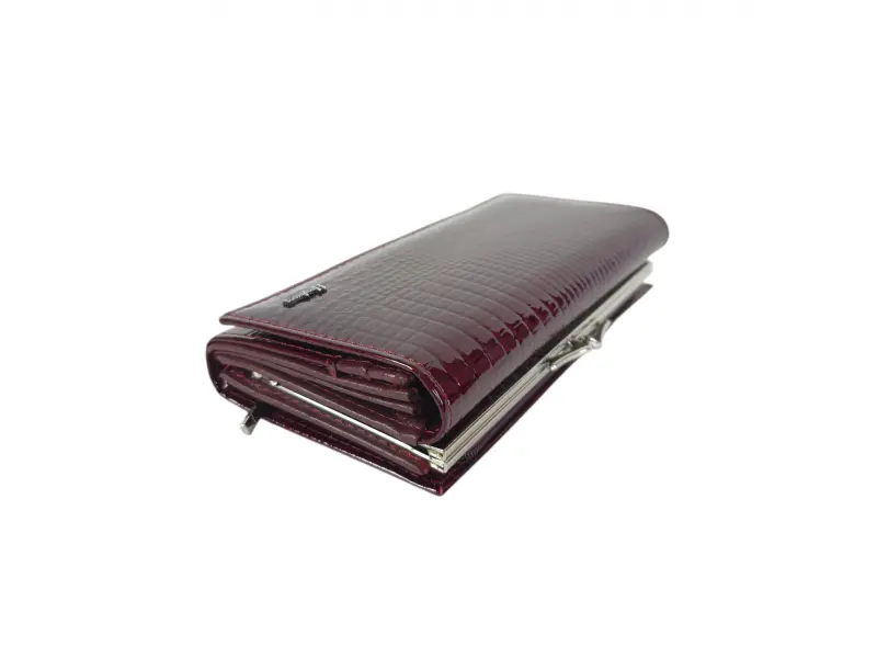 Γυναικείο πορτοφόλι σε μπορντό χρώμα από γνήσιο δέρμα και λουστρίνι. Κομψό γυναικείο πορτοφόλι με θήκες για χαρτονομίσματα, θήκες για κάρτες και προσωπικά έγγραφα και θήκη για κέρματα με κλιπ φερμουάρ. Όμορφο γυναικείο πορτοφόλι με ενδιαφέρον σχέδιο.